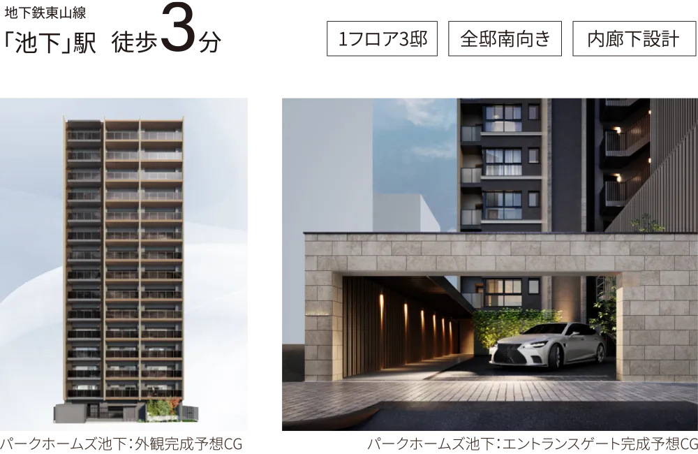 栄、名駅へダイレクトにつながる大動脈、地下鉄東山線「池下」駅から徒歩3分。東山線沿線の街として発展を続ける池下は、洗練されたライフスタイルを彩るショップから、日々のくらしに欠かせない生活利便施設がバランスよく点在しています。