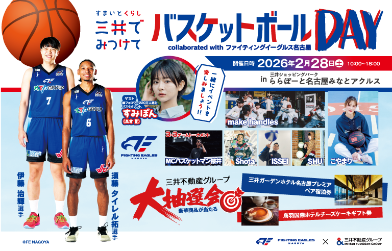 2月28日(土) 三井ショッピングパークららぽーと名古屋みなとアクルス 屋外イベントスペース デカゴンにて「すまいとくらし 三井でみつけて バスケットボールDAY collaborated with ファイティングイーグルス名古屋」が開催されます。一日中バスケ尽くしで楽しんでいただけるイベントへ、是非ご来場ください!