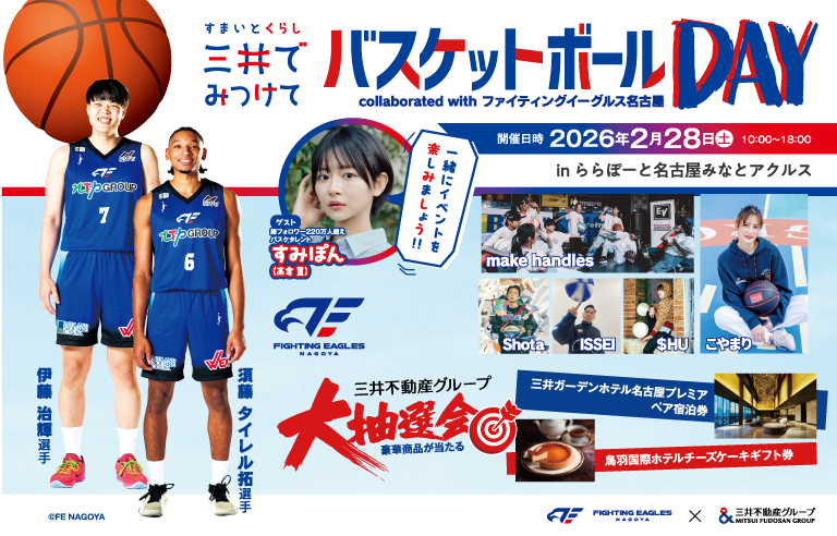 2月28日(土) 三井ショッピングパークららぽーと名古屋みなとアクルス 屋外イベントスペース デカゴンにて「すまいとくらし 三井でみつけて バスケットボールDAY collaborated with ファイティングイーグルス名古屋」が開催されます。一日中バスケ尽くしで楽しんでいただけるイベントへ、是非ご来場ください!