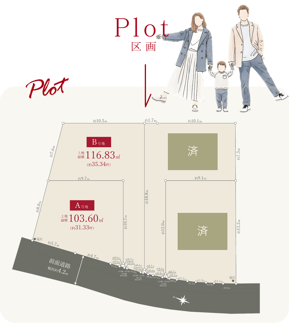 【MOCX GARDEN 大町東 建築条件付宅地 物件概要】 ●所在地/広島市安佐南区大町東3丁目857-3他 ●交通/アストラムライン「大町」駅まで徒歩9分(約700m) ●総区画数/4区画 ●販売区画数/1区画 ●用途地域/第一種住居地域 ●地目/宅地 ●建ぺい率/60% ●容積率/200 % ●法令上の制限/景観法、都市再生特別措置法、街並みガイドライン(自主規制) ●道路/西側幅員約4.2m公道、アスファルト舗装 ●土地面積/117.19㎡(約35.44坪) ●販売価格/2,110万円万円 ●設備などの概要/電気・中国電力(他の電気小売事業者も選べます)、ガス・都市ガス、水道・公営水道、下水・公共下水 ●私道負担/なし ●引渡時期/相談 ●備考/1.法第22条区域、2.建物建築時に上下水道本管引込工事費および水道分担金137,500円(税込:20㎜の場合)ほか申請手数料が掛かります。3.表記の土地面積のうち、以下のように通行を目的とする承役地地役権が設定されます。B号地:土地面積117.19㎡のうち0.24㎡(予定地番857-6)にA号地を要役地とする承役地地役権および0.12㎡(予定地番857-7)にC号地を要役地とする承役地地役権、C号地:土地面積121.36㎡のうち0.24㎡(予定地番857-9)にD号地を要役地とする承役地地役権および0.12㎡(予定地番857-8)にB号地を要役地とする承役地地役権 ●取引態様/売主 ●広告制作年月日/2026年2月2日 ●広告有効期限/2026年2月28日