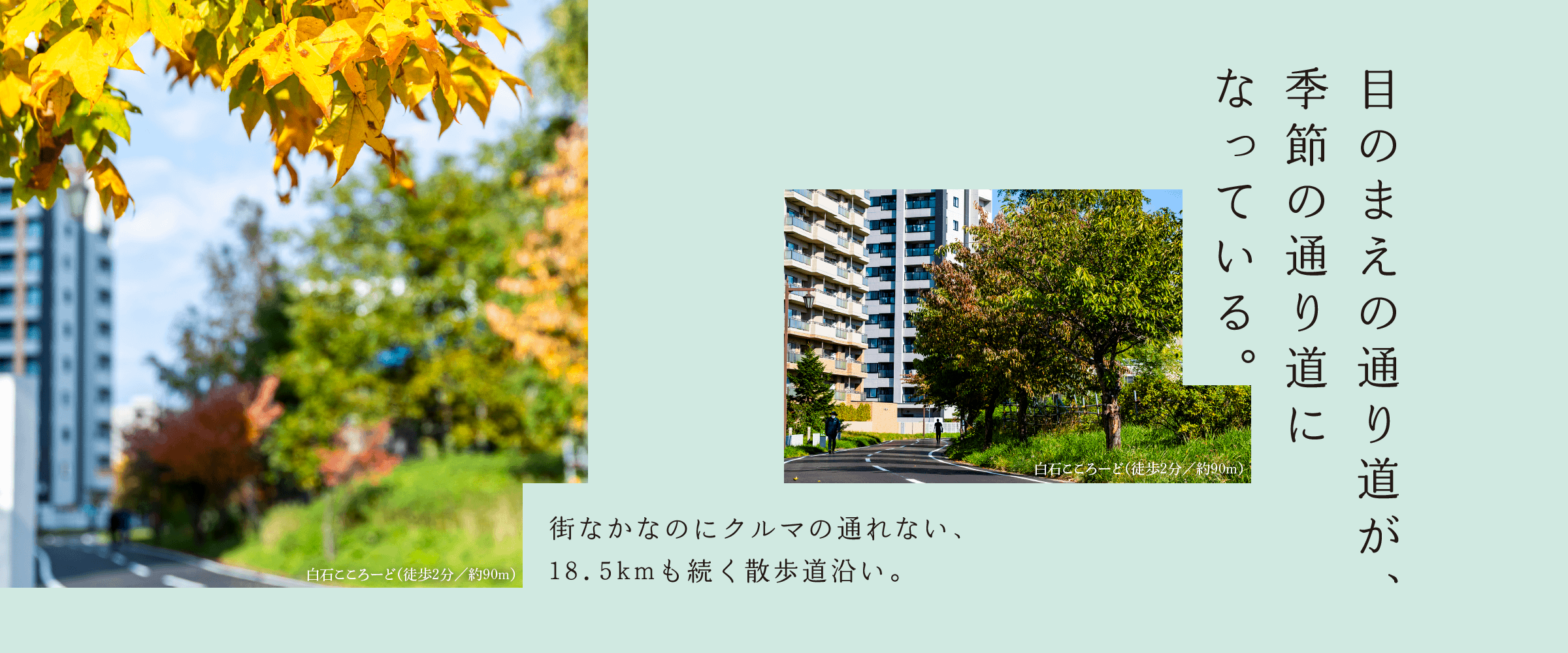 そして、この地の大きな魅力となっているのが、住まいの目の前に広がる歩行者・自転車専用道路「白石こころーど」。車を気にせず散策できる18.5kmの道は、四季の移ろいを身近に感じさせてくれる、日常の中の特別な場所となるでしょう。