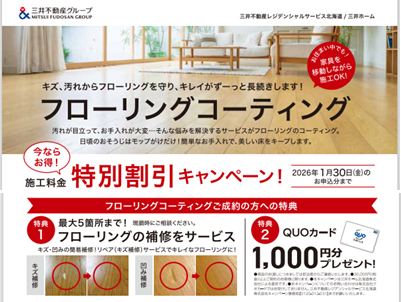 【冬の特別キャンペーン実施中】新築のような美しさをキープ!「ハウスコーティング」で住まいを守りませんか?(2026年1月30日申込分まで) 最新情報 すまいをリフォーム キャンペーン ハウスコーティング 三井でみつけて 住まいのメンテナンス 札幌 #php if ($genre['key'] == 'rent' && !empty(get_field('thumb' . $num . "_addres"))) : ?> 新しい住まいに引っ越したときの、あの清潔で心地よい空間。 その“新築のような美しさ”を、できるだけ長く保ちたいと思いませんか? 特にフローリングや水まわり(キッチン・洗面・浴室)、玄関まわりは毎日の使用で汚れやキズが付きやすく、劣化が気になる場所です。 そんな住まいの美観を長期間キープしたい方におすすめなのが、「ハウスコーティング」です。 ハウスコーティングを施すことで、汚れやキズが付きにくくなり、お手入れもラクになります。 今なら、これから新生活をスタートされる方にぴったりな【冬の特別キャンペーン】として、特別価格でご提供中!