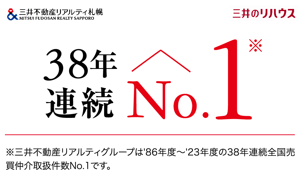 トップ>北海道エリア>未分類>【三井のリハウス】三井のリハウスは全国売買仲介取扱件数、38年連続でNo.1! 買主様にも売主様 にもずっと選ばれています! 【三井のリハウス】三井のリハウスは全国売買仲介取扱件数、38年連続でNo.1! 買主様にも売主様 にもずっと選ばれています! 未分類 2024年6月18日 三井不動産リアルティグループは1986年度から38年連続 全国売買仲介取扱件数 NO1です。不動産売却をご検討の方に向けて、三井のリハウスの特徴・実績・選ばれ続ける理由をご紹介します。 下の画像をクリックすると詳細な情報がご覧いただけます 詳しくはこちら